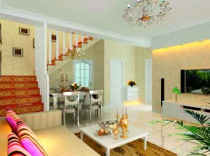 在風(fēng)格設(shè)計(jì)上,基本按照業(yè)主要求的田園風(fēng)格:客廳墻壁以淺黃色壁紙為主,沙發(fā)背景墻則使用花朵壁紙,營造出自然、柔和、甜美的感覺。樓梯采用木質(zhì)階梯,白色扶手與客廳的地面、頂面、家具、門相呼應(yīng),突出干凈大方的環(huán)境。樓梯墻壁較長顯得空白,建議可以做成照片墻,將兩人的相片放置于此,上樓梯的時候能看到成長、認(rèn)識、相戀的過程,感覺溫馨甜蜜。
