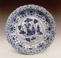 說 明: 此盤圖案結(jié)構(gòu)繁密,色調(diào)濃艷.有結(jié)晶斑點,濃重處凝聚成黑青色或藏青色,有金屬的錫光色澤.胎細白,釉肥潤,是明代景德鎮(zhèn)官窯中的精品.
