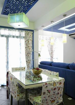 餐廳采用了顏色豐富多彩的軟裝,與客廳冷色調(diào)相比起來多了份喜慶的味道。餐廳與客廳采用了現(xiàn)在比較流行的開放式,這使空間看起來更具整體性與時尚性。為與客廳功能區(qū)分除了在吊頂上大做了文章外,還在餐廳與客廳的分界安裝了吊燈,這樣既起到了區(qū)域劃分作用又節(jié)約了資源(也可以用珠簾做隔斷,珠簾最好采用透明的水晶珠,再安裝上射燈,燈光打上去出來的效果也是很不錯。但最好別用布料這會使空間變得很小缺乏大氣感)。餐廳的花板吊頂把中式風格表現(xiàn)的很到位,這樣的裝飾表現(xiàn)也是比較少見的,一般這樣的裝飾是做在墻壁上的,但不可否定的是這樣設(shè)計確實很有中式的韻味。