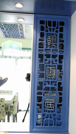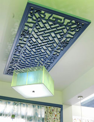 餐廳里的花板吊頂把中式復(fù)古風(fēng)格體現(xiàn)的淋漓盡致。這樣的花板買回來是紅木色的,為突出整體色彩而噴成了藍色,效果不錯哦,配上一盞簡潔現(xiàn)代感十足的吊燈,中式風(fēng)格這種表現(xiàn)使整個空間,傳統(tǒng)中透著現(xiàn)代,現(xiàn)代中揉著古典。