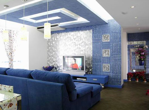 客廳體現(xiàn)了現(xiàn)代中式的復(fù)古情懷。整體以藍色與白色為主打色,這使空間感覺既清爽又有多了份淳樸感。電視背景墻設(shè)計采用銀色的墻紙,這不僅使客廳空間顯得很明亮而且還很漂亮,突出了客廳的個性與時尚感。客廳里采用回紋式的吊頂,這是很少見的現(xiàn)代中式風格的一種設(shè)計表現(xiàn)法(據(jù)說采用回紋設(shè)計是女業(yè)主在逛街的時候偶爾看見的覺得這種圖案很特別,接著在后來很多地方都設(shè)計回紋),這既是現(xiàn)代中式風格標志又與眾不同很有感覺。客廳采用了深色的地磚這與客廳淡雅的色彩形成鮮明的對比,深色的地磚還避免了由于吊頂而產(chǎn)生頭重腳輕的感覺,使空間多了份濃郁的書香氣息。