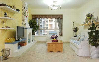 藍(lán)色白色似乎已成為了地中海的標(biāo)志,但如果整個(gè)空間都設(shè)計(jì)成碧海藍(lán)天的感覺,似乎少了點(diǎn)家的味道。把背景墻做成鵝黃色再適合不過了,感覺既溫馨又不失地中海的浪漫情懷。在背景墻壁上做了個(gè)裝飾性的壁爐把地中海風(fēng)格表現(xiàn)的淋漓盡致,壁爐上的馬賽克很有個(gè)性哦,像沙灘上的五彩石又像那五彩繽紛的生活。在客廳每個(gè)角落里都擺放了盆栽使整個(gè)空間充滿了青春的氣息,原木色的家具使空間看起來更具有自然的味道。值得一提的是整個(gè)空間藍(lán)色的深淺搭配的很協(xié)調(diào)硬裝以深藍(lán)色為主,軟裝則以淡藍(lán)色為主,使空間看起來更有層次感。客廳整體感覺安寧靜謐、自由自在。