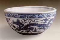 說 明: 此缽造型近似半圓體,畫面青花呈色濃艷深沉,畫意豪放不羈,顯示出宣德青花的特點(diǎn).缽內(nèi)心青花雙圈內(nèi)書"大明宣德年制"兩行六字款.