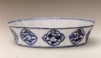 說 明: 此洗內(nèi)外青花裝飾.內(nèi)底繪有折枝石榴紋,外壁十面均作菱形開光,內(nèi)繪折枝花卉.青花發(fā)色濃艷,并有暈散,系用進口"蘇麻離青"料繪制而成.