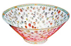 吳錦華立志要“做一些別人沒有做過的事情”,在傳統(tǒng)題材中融入現(xiàn)代風格。在日復(fù)一日的艱苦摸索中,他成功了,1992年,他創(chuàng)作出了后來震驚整個工藝美術(shù)界的“蓋世無雙臉譜碗”。那是在一只直徑87厘米的瓷質(zhì)薄胎大碗上,繪出448個造型各異的臉譜。那只碗幾乎耗費了他一年的時間,那時候,他每天一早就來到工作室,對這吹彈得破的薄胎大碗,殫精竭慮,有時候一整天才能完成一兩個臉譜。最難的是倒置繪畫不易行筆,臉譜之間的結(jié)構(gòu)也令他頗費躊躇,等到大作完成的時候,他幾乎要暈倒在地。