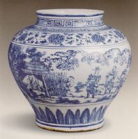 說 明: 人物繪畫生動,筆墨傳神,寓意深刻,并以大片云霧幻景做背景,人物瀟灑飄逸,有如在仙境中云游,仍有宣德青花人物之風韻,這種形象在明中期以后逐漸發(fā)生變化.