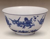說 明: 胎質(zhì)細(xì)白堅致,透明釉細(xì)潤,具有成化輕巧俊秀的造型特點.青花發(fā)色清新淡雅,是典型的成化陂塘青的發(fā)色.碗底有帶雙方框的"大明成化年制"青花楷書款,是典型的成化官窯器物.