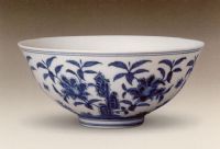 說 明: 碗胎質(zhì)較薄,釉質(zhì)細(xì)膩?zhàn)虧?青花呈色淡雅,是成化時(shí)期青花瓷器中的代表作品.底有青花雙圈"大明成化年制"雙行六字楷書款.