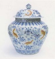 說 明: 以幽青雅致的青花繪蓮花和藻萍,鮮艷的黃上紅彩繪十二尾游魚.罐底青花雙圈"大明嘉靖年制"款.畫面生動(dòng),紋飾疏密均勻.