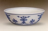 說 明: 全器胎白體薄,白釉腴潤,青花色澤淡雅明快.器外底心為青花雙圈"大明成化年制"六字雙行楷書款.