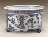 說 明: 胎白釉厚,內外白釉,溫潤似脂,釉下青花紋飾,白砂底.整個畫面表現的是昭君出塞的故事.