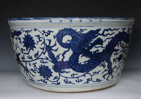 省文物鑒定專家金波告訴記者,繪有龍形的瓷器名叫“明嘉靖青花龍缸”。經(jīng)過鑒定,該“龍缸”為明代真品,缸體屬于矮身構造。自宣德以來,許多瓷都就在嘗試燒造大型的陶瓷器,特別是這種大缸。為此,那里的窯廠還專門修造了用于燒制龍缸的小型窯爐。不過,當時這個嘗試一直沒有成功。直到明代中晚期的正德、嘉靖時期,類似大型龍缸才在景德鎮(zhèn)燒制成功,主要用于皇陵、太廟等皇家祭祀。