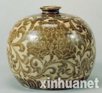 白地褐花牡丹紋瓶,高17.3厘米。日本重要文化財,北宋定窯產(chǎn)品。瓶小口微敞,頸部極短,圓肩圓腹,大平底。此種造型俗稱"吐嚕瓶",與后代的太白尊極為相似,應(yīng)是后者的濫觴。宋代定窯除生產(chǎn)白釉器外,還生產(chǎn)有黑釉、醬釉、綠釉及白地褐花(即鐵銹花)等品種。此器的裝飾手法應(yīng)為剔花,即在器表施上褐色釉料,待釉料半干時,將花紋部分或紋樣以外的釉層剔去,露出胎體,施釉燒成后釉色與胎地形成對比,花紋具有淺浮雕的裝飾效果。剔花裝飾技法始于磁州窯,后陸續(xù)被其他窯場采用。