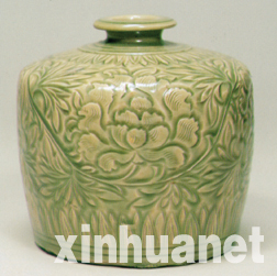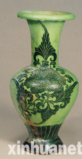 綠釉黑花牡丹紋瓶,高35厘米,宋代磁州窯系產(chǎn)品。日本重要文化財。此瓶造型優(yōu)美,口沿向外翻卷,形似一朵盛開的大喇叭花,修長的頸部至肩部微微內(nèi)收,圓潤的斜肩,肩以下向內(nèi)急收至底部又向外撇,形成一個喇叭形底足,瓶的最大徑位于肩腹交界處。整個形體似一曲跌宕起伏的樂曲,富有節(jié)奏與韻律美。紋樣的布局也別出心裁,將一片花葉布置在頸部,頗具新意。瓶的胎土雖不甚細(xì)白,但使用了化妝土裝飾工藝,這也是磁州窯系常常運(yùn)用的方法,以遮蓋胎土的缺陷,使釉面顯得亮麗勻凈,色彩對比分明。綠釉黑花是瓷器釉下彩品種之一,是在燒成的白底黑花器上罩一層綠釉,再經(jīng)低溫?zé)伞4似黠@然是在用黑彩繪畫后,又用尖狀工具勾劃出紋樣的輪廓線及花筋葉脈,再罩上綠釉。