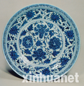 青花牡丹紋盤,元代景德鎮(zhèn)窯產(chǎn)品。這是一件私人捐贈的藏品,也被指定為日本重要文化財。此盤折沿,器形碩大,口徑達(dá)44.5厘米。裝飾有圖案式紋樣,分為三層,盤內(nèi)底中央飾四朵不同樣式的卷枝牡丹花,盤壁是二方連續(xù)纏枝番蓮,口沿飾細(xì)線卷云紋,各層花紋之間以兩組細(xì)雙線弦紋相間。盤外壁與內(nèi)壁的花紋相同。青花料顯然使用了進(jìn)口的波斯鈷料,這種鈷料含錳量少,含鐵量高,且含鉀,青花色澤濃艷幽靚。這件青花盤恰到好處地運(yùn)用了此種鈷料有深色結(jié)晶斑塊的特點(diǎn),形成了花朵濃淡有別的立體感和透視效果。底足內(nèi)無釉,可看出胎質(zhì)細(xì)白堅(jiān)致,圈足非常規(guī)整,這似乎與元青花修坯不夠精細(xì)的特點(diǎn)相悖,是元代景德鎮(zhèn)青花瓷器中的一件精美之作。