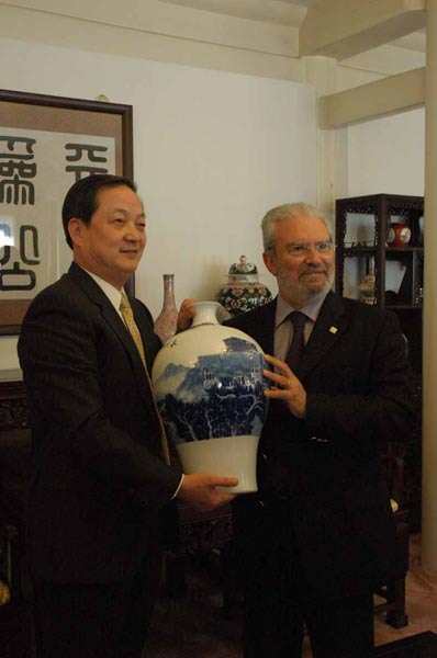 祈愿世界和平,祝福北京奧運(yùn)。歷時(shí)3年,一件由中國(guó)國(guó)家博物館權(quán)威監(jiān)制,由“當(dāng)代官窯”國(guó)家用瓷辦公室、景德鎮(zhèn)珠山畫院制作,中國(guó)宋慶齡基金會(huì)發(fā)行,中國(guó)瓷壇泰斗王錫良、“青花大王”王步嫡親傳人王恩懷、景德鎮(zhèn)珠山畫院院長(zhǎng)熊鋼如三位中國(guó)工藝美術(shù)大師聯(lián)袂創(chuàng)作的“永久和平”國(guó)禮珍藏青花梅瓶燒制成功,并將在全國(guó)部分重點(diǎn)城市與公眾陸續(xù)見(jiàn)面。