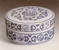 說 明: 因正德皇帝崇信伊斯蘭教,故此時御用瓷器上以波斯文、阿拉伯文為紋樣的風氣廣為盛行.此盒造型規(guī)整,其表面滿青花紋飾.