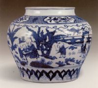 說 明: 此罐胎白堅細(xì).釉泛微青.青花料色藍(lán)紫,人物神態(tài)生動.足底書青料"大明嘉靖年制"款.