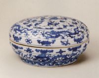 說(shuō) 明: 此盒胎體厚重,青花色調(diào)藍(lán)中泛紫,濃艷欲滴.紋飾描繪精細(xì).所繪人物形象較夸張,四肢圓胖,后腦大,頭重腳輕,比例失調(diào),這種繪畫(huà)風(fēng)格具有鮮明的時(shí)代特色.