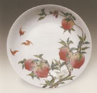 說 明: 此盤紋飾著色濃淡相宜,構(gòu)圖亦生動活潑,有一枝紅杏出墻來的意境.