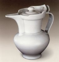 說 明: 僧帽壺闊頸,一側(cè)有流,前伸似鴨嘴狀.另一側(cè)有寬帶形曲柄.通體及足內(nèi)均施白釉.