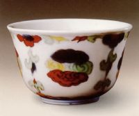 說(shuō) 明: 此杯構(gòu)圖新穎別致,使人耳目一新.由于高溫?zé)撇粔蚶硐?致使釉色白中泛黃,青花發(fā)色藍(lán)中泛灰.但整體裝飾色彩艷而不俗,具有沉穩(wěn)典雅的藝術(shù)韻致.