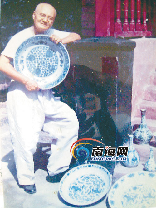 韓槐凖收藏的珍貴瓷器,手中拿的是青花大碗。本版圖片除署名外均由陳耿 翻拍。感謝海南省文化歷史研究會(huì)王春煜教授對(duì)本文采寫提供相關(guān)資料