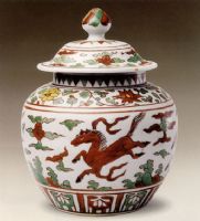 說(shuō) 明: 此罐造型端莊,胎堅(jiān)釉潤(rùn),構(gòu)圖嚴(yán)謹(jǐn),色彩明快清麗,四馬極富動(dòng)態(tài).整個(gè)畫面不使用青花,屬于純釉上五彩作品.