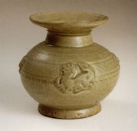 說(shuō) 明: 此器的貼塑紋飾技巧頗高,在同類(lèi)器中屬出類(lèi)拔萃之作,辟邪形象活潑生動(dòng),栩栩如生,甚屬難得.