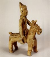 說 明: 灰胎,刷青釉,胎釉結(jié)合不好,部份脫落.該俑人物面部及冠與馬頭飾,雕刻細(xì)膩傳神,不失為早期青瓷模俑類的優(yōu)秀作品.