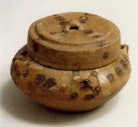 說(shuō) 明: 此器的褐色點(diǎn)彩較豐富,蓋頂分布成"十"字形,肩部點(diǎn)綴一周,又以耳為中心,繞一圈,求得變化.
