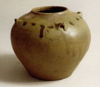 說 明: 通體施釉,釉色青淡而顯白.肩部除附有四個橫耳外,各耳間飾有褐色點彩.