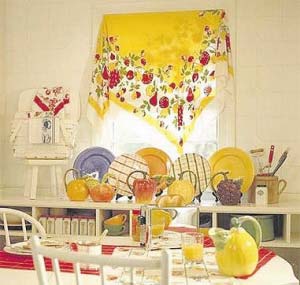 將喜歡的絲巾對角折起來用圖釘掛在窗口,再在下方的矮柜上將自己平時(shí)收集的顏色與絲巾相配的美麗餐具擺設(shè)起來,是不是別有情調(diào)?如若搭配上白色的百褶簾,效果更好。