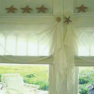 這一種裝飾窗戶的方法特別適合喜歡大海的你。將渡假時(shí)購買的海星等貝殼選出完整漂亮的一些,背后用萬能膠將圓頭圖釘粘牢,用它們將白色的窗紗釘在窗戶上方的窗框上,窗框上方再擺放幾支美麗的海星,大海的味道就帶回家了。