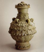 說 明: 北朝.此器通體施青釉,色黃綠.集中運用印貼、刻劃和堆塑等藝術(shù)手法,融粗凸細凹于一體,氣韻華貴典雅.