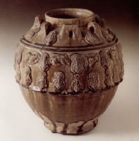 說 明: 此罐制作工整,應用貼花工藝裝飾,代表了北朝青瓷的水平,是當時珍貴的工藝品.