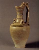 說(shuō) 明: 胎質(zhì)疏松,胎骨較輕,胎色灰白.造型修長(zhǎng).釉色青中閃黃.為隋代雞首壺之典型.