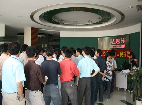 15日下午2時,法恩莎員工齊聚在法恩莎大廳舉行了抗震救災(zāi)捐款活動,大家排起長龍,紛紛慷慨解囊,一百、兩百、三百……投入了募捐箱,現(xiàn)場涌動著一片融融真情,感染著在場的每一位在場人員。一位來辦事的男士看到大家爭相捐助,當(dāng)即掏出一百元參加募捐活動,他激動說道:“災(zāi)難無情人有情,看到災(zāi)區(qū)人民正經(jīng)受著這么大的災(zāi)難,我也要為災(zāi)區(qū)人民獻(xiàn)出自己的一份愛心。”