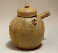 說 明: 釉色青中泛黃,均勻凝潤.方形橫把的設(shè)計別具匠心,不但豐富了唐代壺把的式樣,且便于提攜和傾倒.