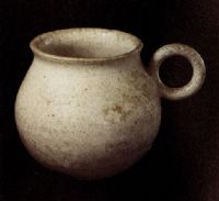 說(shuō) 明: 環(huán)把小斗,也稱單耳罐,是仿唐代銀器的式樣.胎薄體輕,釉白中閃青,釉面布滿細(xì)小開片紋,是唐代貴族使用的精美酒具之一.