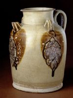 說 明: 器體較渾圓,周身施釉,釉色青綠有光,釉下是褐斑彩貼,素底,胎色灰白.