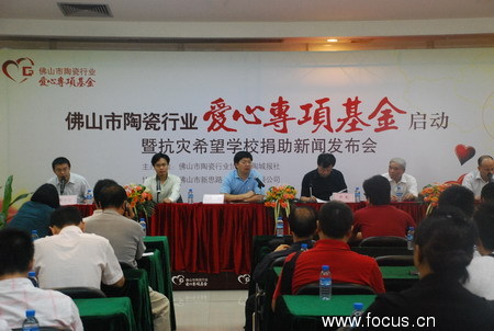 2008年6月3日上午9點,“佛山市陶瓷行業(yè)愛心專項基金啟動暨抗震救災(zāi)希望學(xué)校捐助新聞發(fā)布會”在中國陶瓷城四樓會議室舉行。佛山市陶瓷行業(yè)協(xié)會秘書長尹虹、陶城報社社長劉小明、陶瓷企業(yè)代表歐文萊陶瓷市場總監(jiān)陳效東等出席啟動儀式。就本次賑災(zāi)募捐活動以及后續(xù)的工作計劃,佛山市陶瓷行業(yè)協(xié)會秘書長尹虹、陶城報社社長劉小明回答了到場媒體的提問。