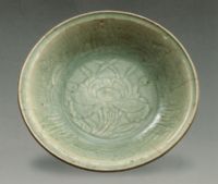 說(shuō) 明: 內(nèi)底刻荷花、荷葉,刻花造型飽滿,非常生動(dòng)。施天青色透明玻璃釉,有冰裂紋。