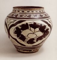 說 明: 底部露胎,胎體磚紅色,胎質(zhì)堅細。器外施滿白色底釉,上繪黑褐色花卉圖案。