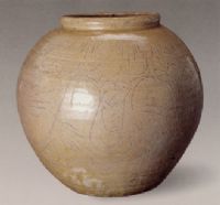 說(shuō) 明: 環(huán)口圓腹,造型渾樸,通體施帶黃色的透明釉。