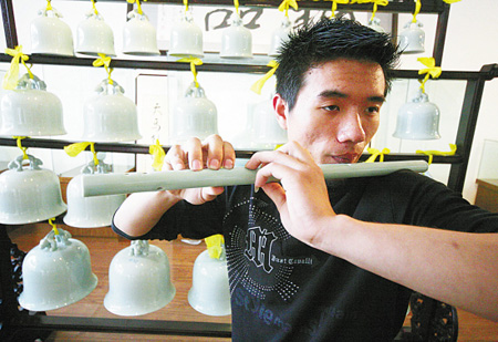 為了每一個(gè)“標(biāo)音”,他不知花費(fèi)了多少心思和功夫。他曾連續(xù)180余天沒有找出一件標(biāo)準(zhǔn)音質(zhì)的瓷品,只能全部砸掉重來。“有時(shí)候僅僅差幾毫米的釉度,音質(zhì)就不一樣了。”