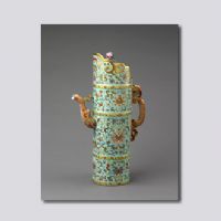 乾隆時(shí)期將"藏傳佛教"作為國(guó)教,在宮中經(jīng)常進(jìn)行佛教法事,由于蒙藏地區(qū)的佛教僧侶與清宮往來(lái)頻繁,故在清御窯廠仿制了一些符合蒙藏生活習(xí)俗的器皿多穆壺,供佛教高僧使用或賞賜之用。瓷質(zhì)多穆壺有粉彩、青花、仿木釉等品種,另外還有琺瑯、象牙、漆器等材質(zhì)。