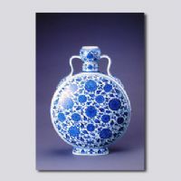 此壺仿永樂青花綬帶耳扁壺造型,是在乾隆皇帝的授意下,將永樂瓷器尺寸加大,并將造型略加改進(jìn)而燒造。底書青花"大清乾隆年制"篆書款。