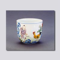 首都博物館藏。敞口,深腹,臥足。外壁繪童子與雞相嬉成趣的情景,旁繪山石、牡丹花,畫面上小孩體態(tài)生動(dòng)形象,雌雞與四只小雞覓食嬉戲,山石清秀。另一側(cè)書乾隆御制詩,共132字。底書青花“大清乾隆仿古”6字3行篆書款。色彩艷麗,畫面生動(dòng)活潑,造型精巧。