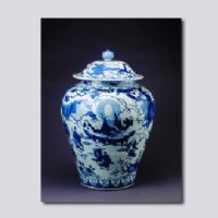 首都博物館藏。直口,短頸,豐肩,收腹,砂底,寶珠形鈕蓋。蓋上繪龍穿花。腹部主題紋飾為群仙祝壽圖:畫面中心繪一巨大的壽星坐于山石之上,周圍繪有鶴、鹿、石及人物22個(gè)。外底書青花雙圈“大明嘉靖年制”楷書款。